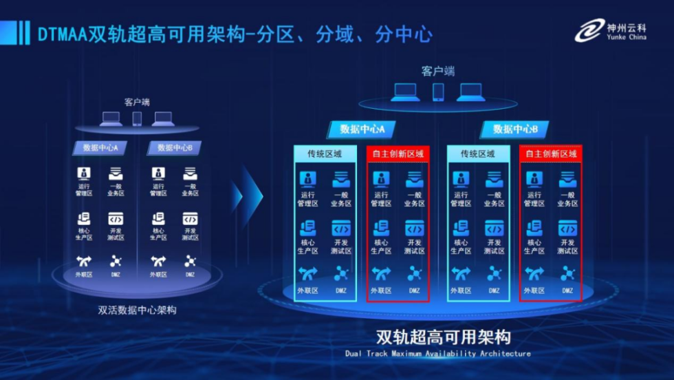 为帮助金融客户更好地应对数字经济时代对可持续性的高要求,实现“信创”与“数字化”齐头并进,dcbox小金库app推出了双轨超高可用架构。该架构在双活数据中心的分区调度基础上,增加信创域和非信创域的分域调度,实行信创域与传统域应用全量部署,使双中心运营变为双中心四区域并行运行,互为多活,将“0到1”的单轨建设道路变为分区分域协同的多活双轨超高可用架构。帮助客户在新架构下,保障“信创”的同时解决性能瓶颈,提升稳定性,保证应用可持续性,最终实现信创区域和非信创区域的平滑过渡,完成国产化替代目标。